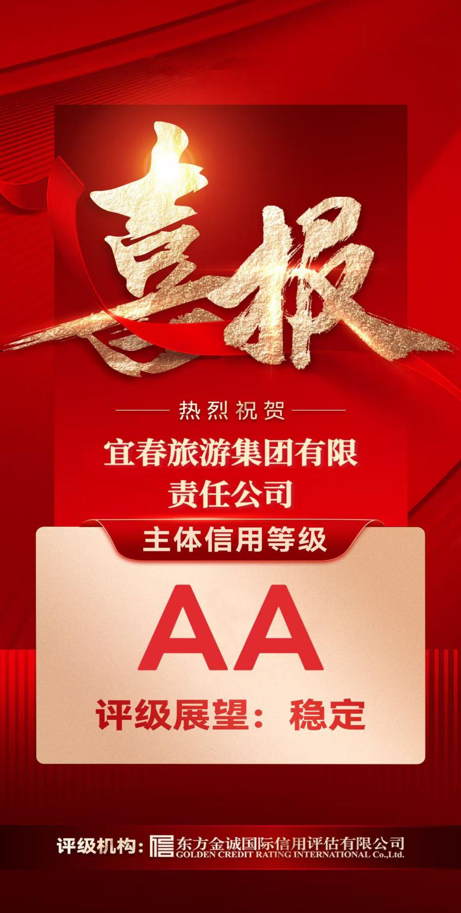 宜春旅游集團(tuán)有限責(zé)任公司經(jīng)國內(nèi)權(quán)威信用評級機(jī)構(gòu)東方金誠國際信用評估有限公司綜合評定,成功獲得“AA”主體信用等級,評級展望為穩(wěn)定。