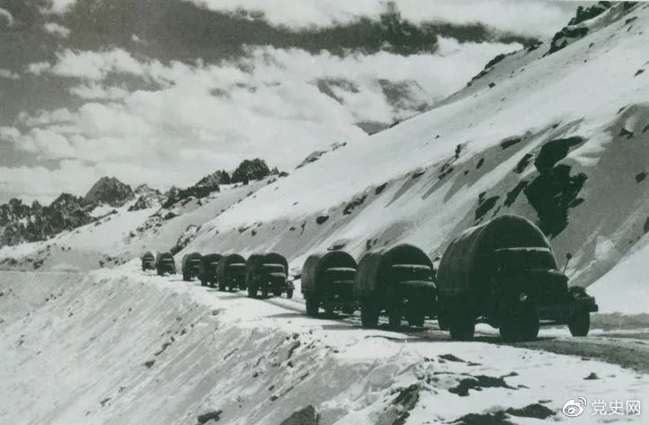 1954年12月,貫通”世界屋脊”的康藏、青藏兩條公路全線正式通車。圖為行駛在康藏公路上的車隊(duì)。